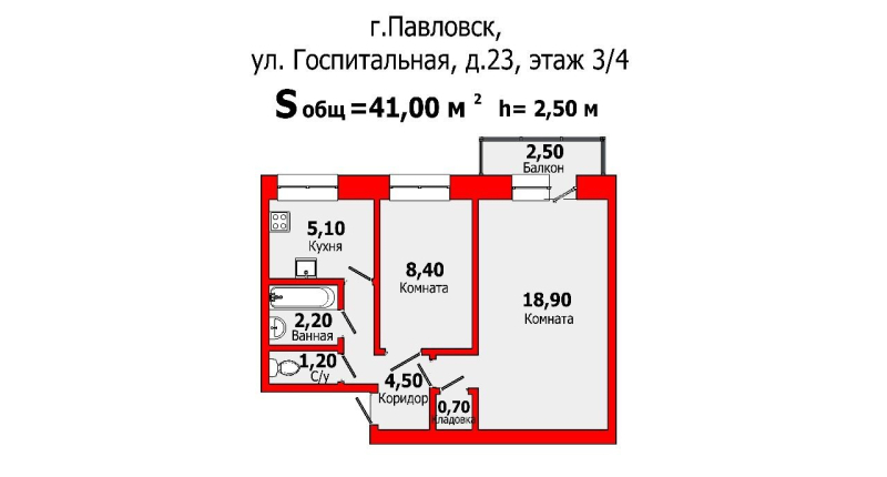 Общая: 41 м2, жилая: 27.3 м2, кухня: 5.1 м2, этаж: 3 (всего: 4), кол-во комнат: 2