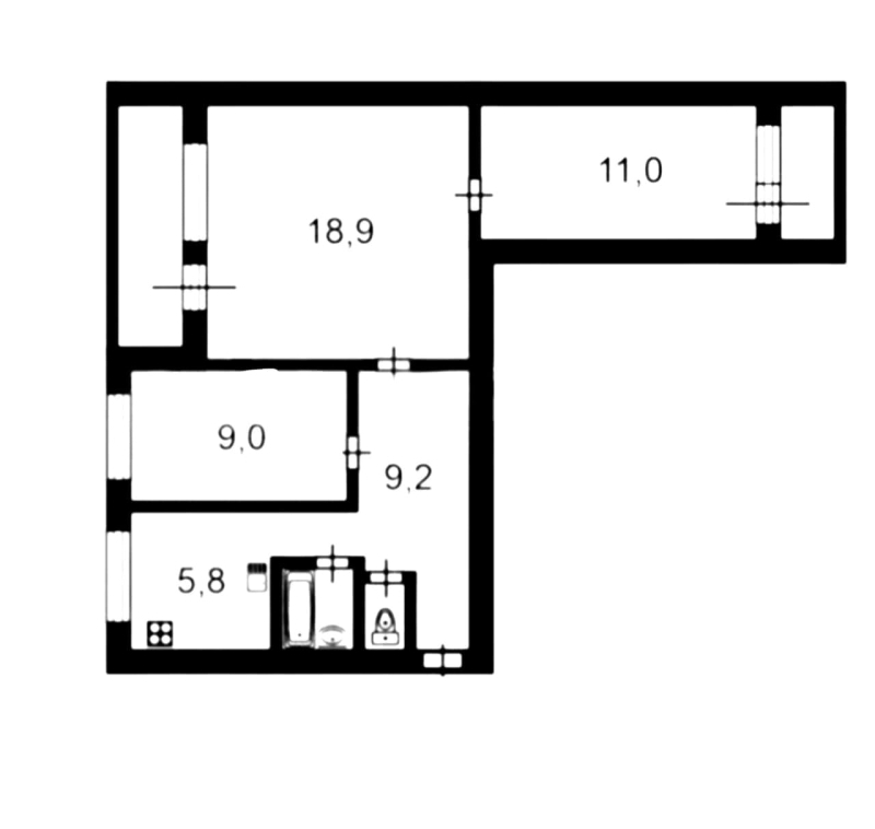 Общая площадь 57,1 кв.м. Планировка смежно-изолированная: комнаты (18,9+11)+9 кв.м. Кухня 6 кв.м. Раздельный санузел. Двусторонняя планировка, в квартире две лоджии, деревянные стеклопакеты, паркетный пол. Все инженерные системы в рабочем состоянии. Требуется ремонт.
